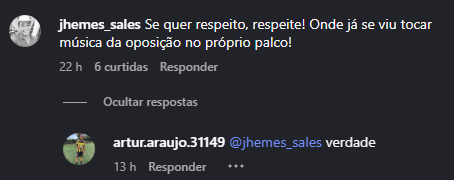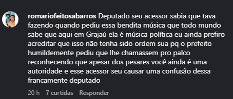 No perfil do deputado, internautas deixaram claro que não engoliram a provocação feita com a execução da música “Pé de Coco”, associada ao grupo político do ex-prefeito Mercial Arruda. O comentário de @jhemes_sales resume o sentimento geral: “Se quer respeito, respeite! Onde já se viu tocar música da oposição no próprio palco!”. Já @vanderleisousado foi direto: “Você se comportou como um arruaceiro. Comporte-se como um parlamentar e não como um desordeiro.”
