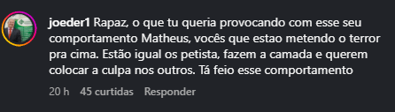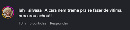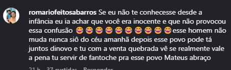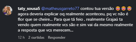 Houve quem denunciasse a premeditação da confusão: “Isso aí foi de caso pensado”, escreveu @karla_oliveira_123. Já @taty_sousa5 foi categórica ao dizer que Mateus “não é flor que se cheire” e que Grajaú está vendo “quem realmente vocês são”. Em outro comentário, @romariofeitosabarros, que diz conhecer Mateus desde a infância, lamentou: “Esse homem não muda nunca.”