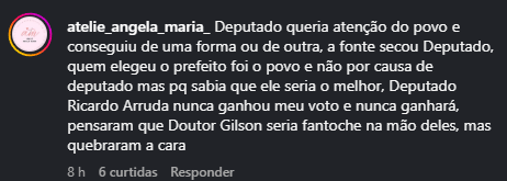 Outros ainda defenderam publicamente o prefeito Gilson Guerreiro e expuseram o oportunismo do deputado. A usuária @atelie_angela_maria_ escreveu: “Quem elegeu o prefeito foi o povo e não por causa de deputado. […] Pensaram que Doutor Gilson seria fantoche na mão deles, mas quebraram a cara.”