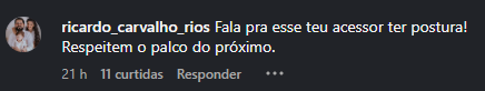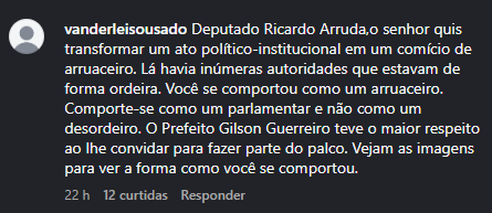 No perfil do deputado, internautas deixaram claro que não engoliram a provocação feita com a execução da música “Pé de Coco”, associada ao grupo político do ex-prefeito Mercial Arruda. O comentário de @jhemes_sales resume o sentimento geral: “Se quer respeito, respeite! Onde já se viu tocar música da oposição no próprio palco!”. Já @vanderleisousado foi direto: “Você se comportou como um arruaceiro. Comporte-se como um parlamentar e não como um desordeiro.”
